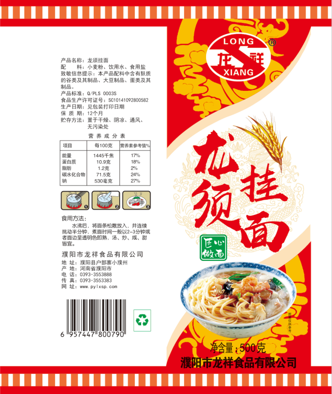 濮陽(yáng)市龍祥食品有限公司位于河南省濮陽(yáng)縣戶部寨鎮(zhèn)小濮州,始建于1994年,前期投資200萬(wàn)元,經(jīng)過(guò)幾年的努力,大力開發(fā)市場(chǎng),由于市場(chǎng)的需求量急劇上升,出現(xiàn)供不應(yīng)求,于2004年擴(kuò)建,建成一座新型的現(xiàn)代化面粉加工企業(yè),并擁有全國(guó)先進(jìn)全自動(dòng)生產(chǎn)設(shè)備一套,產(chǎn)量由以前的100噸/天,提高到現(xiàn)在400噸/天。 2012年再次擴(kuò)大規(guī)模申請(qǐng)為濮陽(yáng)市龍祥食品有限公司,注冊(cè)資金500萬(wàn)元。2012年又投資800萬(wàn)元新建掛面生產(chǎn)線一條,日產(chǎn)掛面50噸。龍祥食品有限公司現(xiàn)有職工120余人,總工程師1人,專業(yè)技術(shù)人員10人,經(jīng)濟(jì)師1人,會(huì)計(jì)師1人,銷售人員2人,優(yōu)秀專業(yè)人員20余人。  龍祥公司自創(chuàng)建以來(lái),社會(huì)效益十分可觀。公司一直以“今天的質(zhì)量,明天的市場(chǎng)”為信念,“一切為了客戶需求,竭誠(chéng)追求完美品質(zhì)”為企業(yè)宗旨,走專業(yè)化經(jīng)營(yíng)和職業(yè)化管理的路子。